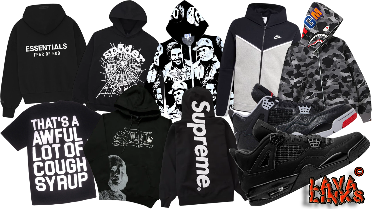 Sp5der, Hellstar, Asaali, Nike, Supreme, Cough Syrup, Chrome Hearts, Bape, Gallery Dept., Purple, Amiri, Ksubi, Essentials, Denim Tears, Balenciaga, Valley, Burberry, Godspeed, GEEDUP, Eric Manuel, Trapstar, Mixed Emotion, Ralph Lauren, LuLuLemon, Labubu, Shoes, Belts, and more.